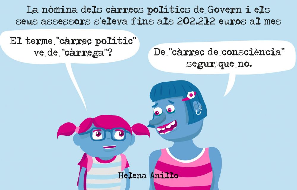 Els principals càrrecs polítics del Govern i els seus assessors, en conjunt, percebran cada mes, bruts, 202.212 euros. Segons Helena Anillo, són càrrecs, però no pas de consciència.