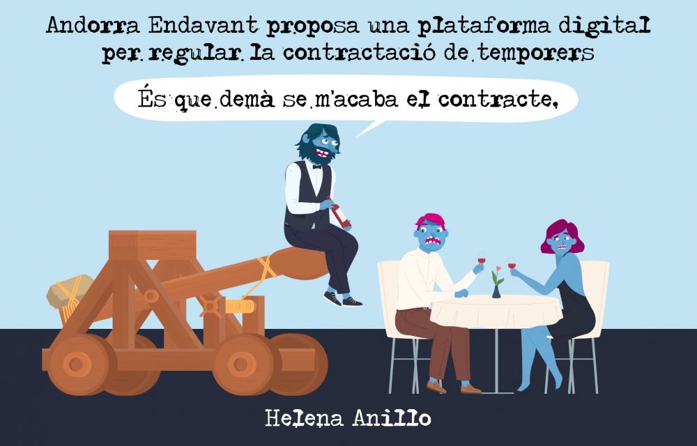Amb aquesta vinyeta, Helena Anillo ha volgut caricaturitzar la proposta d’Andorra Endavant de crear una plataforma digital per regular la contractació de temporers i assegurar-se que retornin al seu origen.