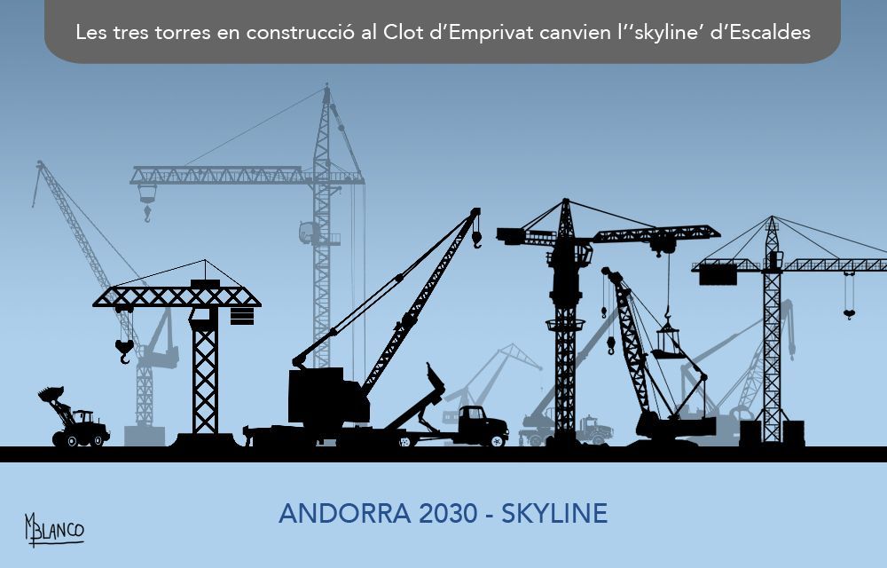 Un bon nombre de grues de grans dimensions omplen en part el Clot d’Emprivat per facilitar la construcció dels edificis que han de conformar el nou ‘skyline’ d’Escaldes. Martín Blanco dibuixa un perfil escaldenc a base de grues.