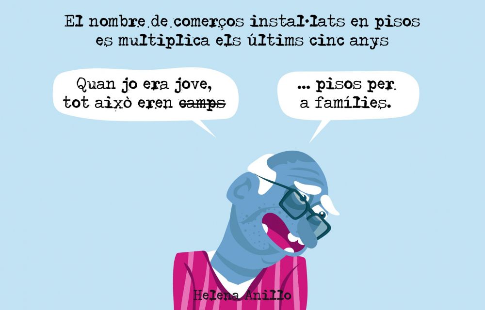 Helena Anillo reflexiona sobre com han canviat els temps i com els pisos que abans eren per famílies, ara molts d’ells s’han convertit en espais per acollir comerços, multiplicant-se aquesta xifra en els últims cinc anys.