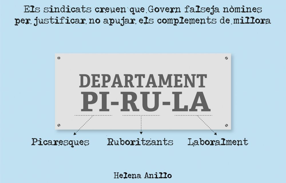 Vuit sindicats i associacions de personal del Govern i de Justícia han anunciat aquest dilluns que presentaran una denúncia judicial contra la decisió del Govern de no augmentar en un 3% el complement de millora dels funcionaris a qui sembla que estiguin fent una pirula.