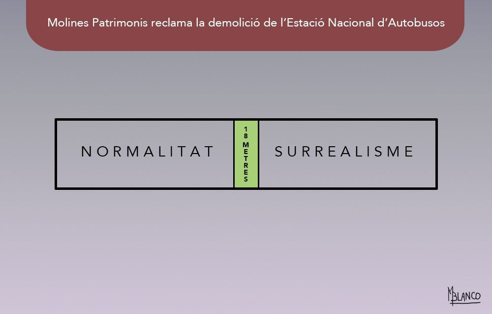 Molines Patrimonis vol que l’Estació Nacional d’Autobusos s’aterri. El motiu són els 18 metres que no fa el vial que enllaça la Baixada del Molí i Doctor Vilanova. Aquests 18 metres són, per Martí Blanco, els que separen la normalitat del surrealisme.