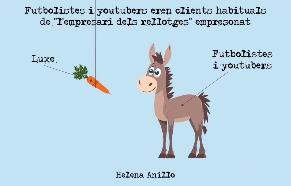 Futbolistes i youtubers eren clients habituals de ‘l’empresari dels rellotges’ empresonat i Helena Anillo els imagina com un ase perseguint una pastanaga.
