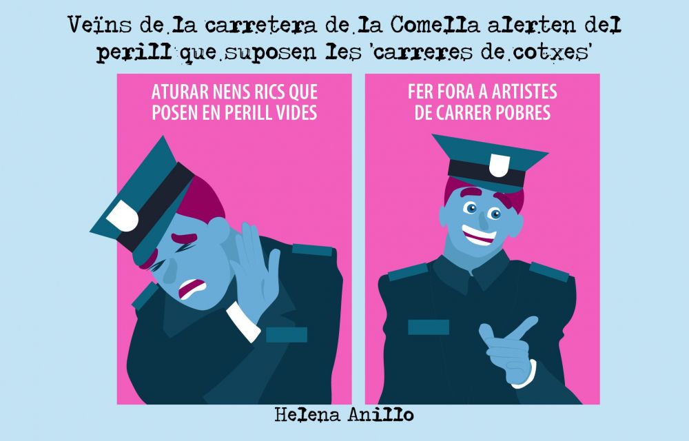 Alguns veïns de la Comella alerten del perill que suposen les ‘carreres de cotxes’ i Helena Anillo recorda que per fer fora artistes de carrer pobres la policia va ser més contundent.