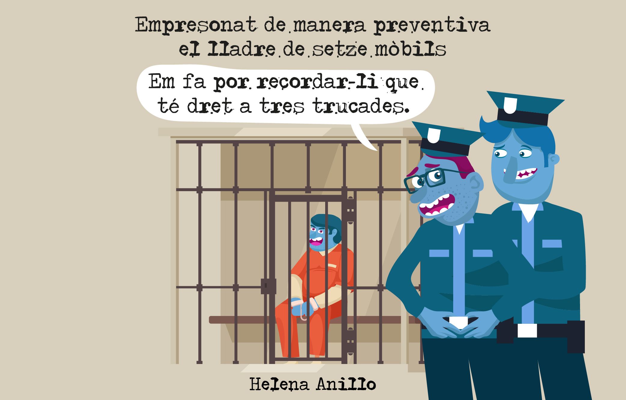 La detenció d’un home no resident de 44 anys el passat diumenge en un centre comercial de Sant Julià amb setze mòbils a l’interior d’una motxilla no ha passat desapercebuda per Helena Anillo, que en la seva vinyeta recorda al processat que a la presó només es permeten tres trucades.