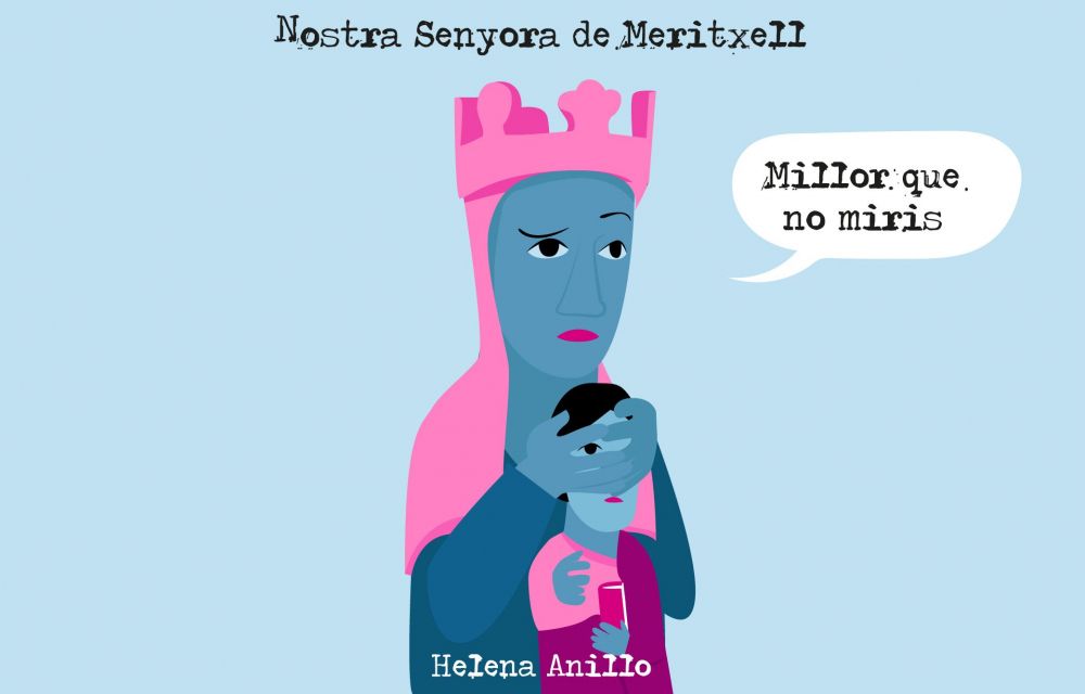 L'alegria per la celebració de la festa de Nostra Senyora de Meritxell no ha d'amagar els problemes que pateix el país, com ara l'habitatge o l'augment dels preus. La verge sosté amb les dues mans la cara del nen Jesús i, segons Helena Anillo, dubta entre tapar-li o no els ulls.